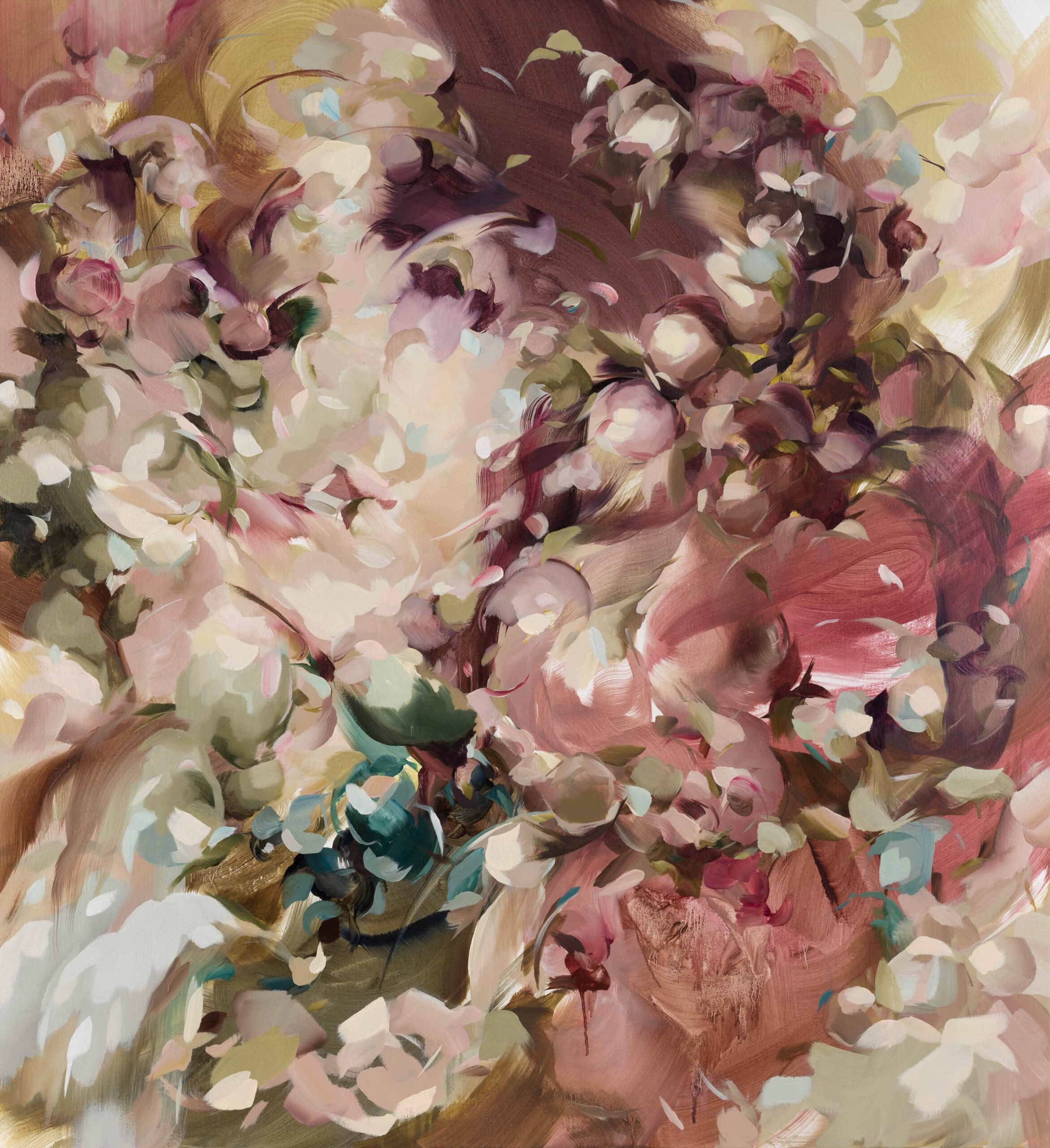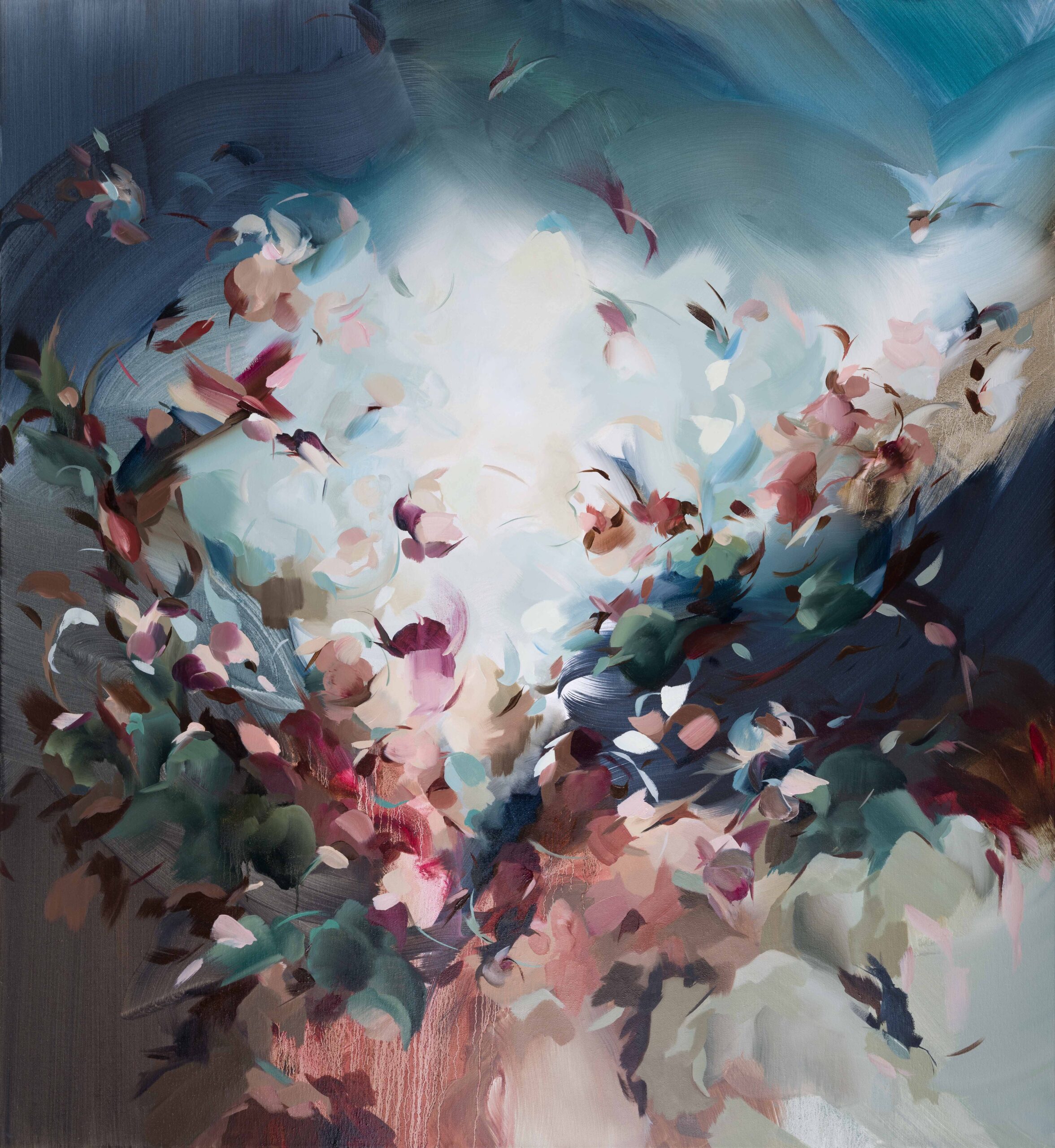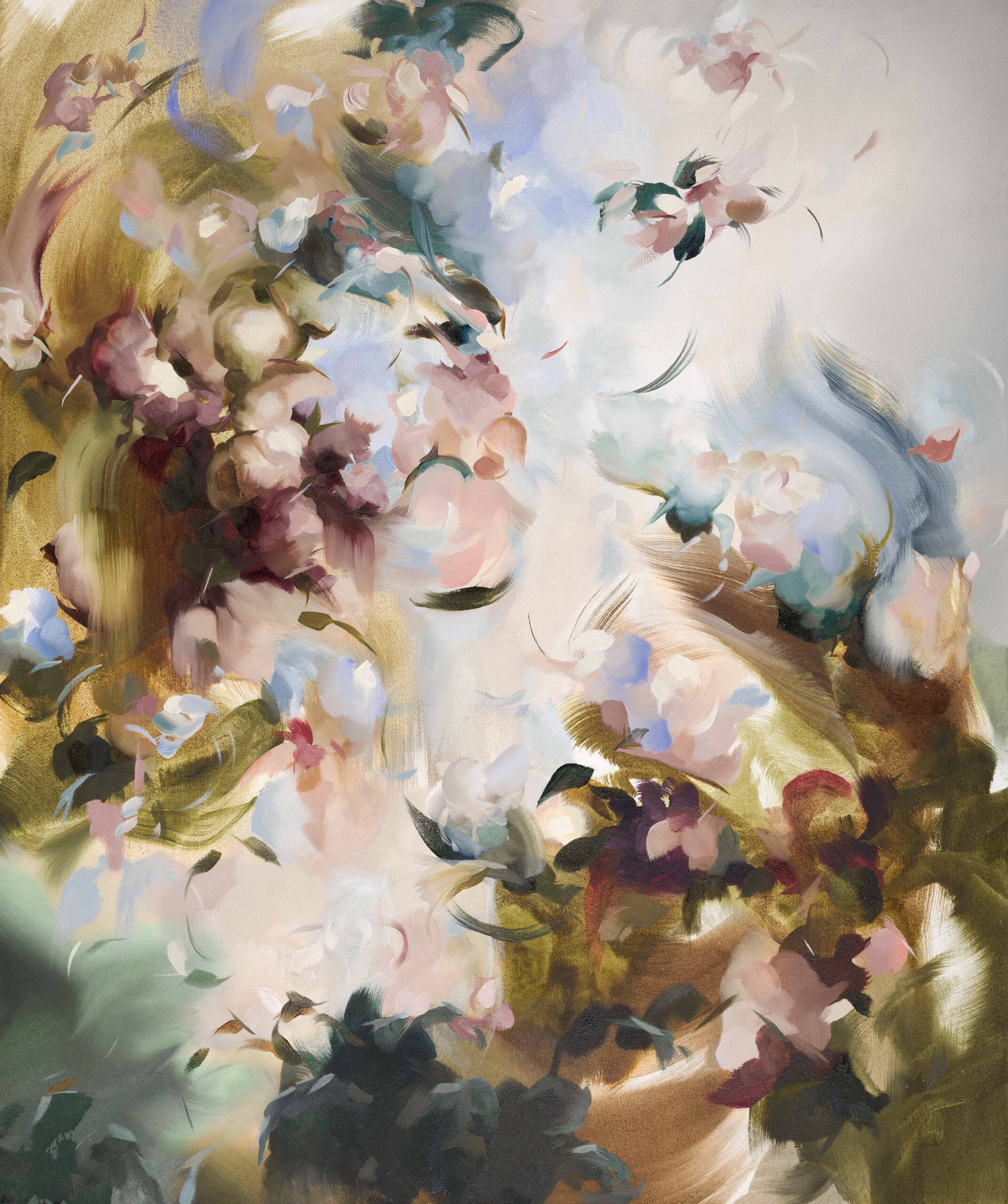 Her process begins with sourcing references from classical paintings, approached under intentional time constraints so that light, pigment, and rhythm are absorbed fleetingly, then recalled purely through intuition. From these impressions she constructs canvases of broad contrasts, spatial rhythms, and soaring moments that guide the eye across the surface. Some passages are rendered in detail, others left raw, preserving tactility of the painting process. What emerges are works that operate as visual memories: fleeting experiences slowed into paint, where petal-like forms, atmospheric veils, and gestural flourishes drift across imagined terrains. The compositions envelop the viewer in an environment that is both deeply present and curiously placeless.