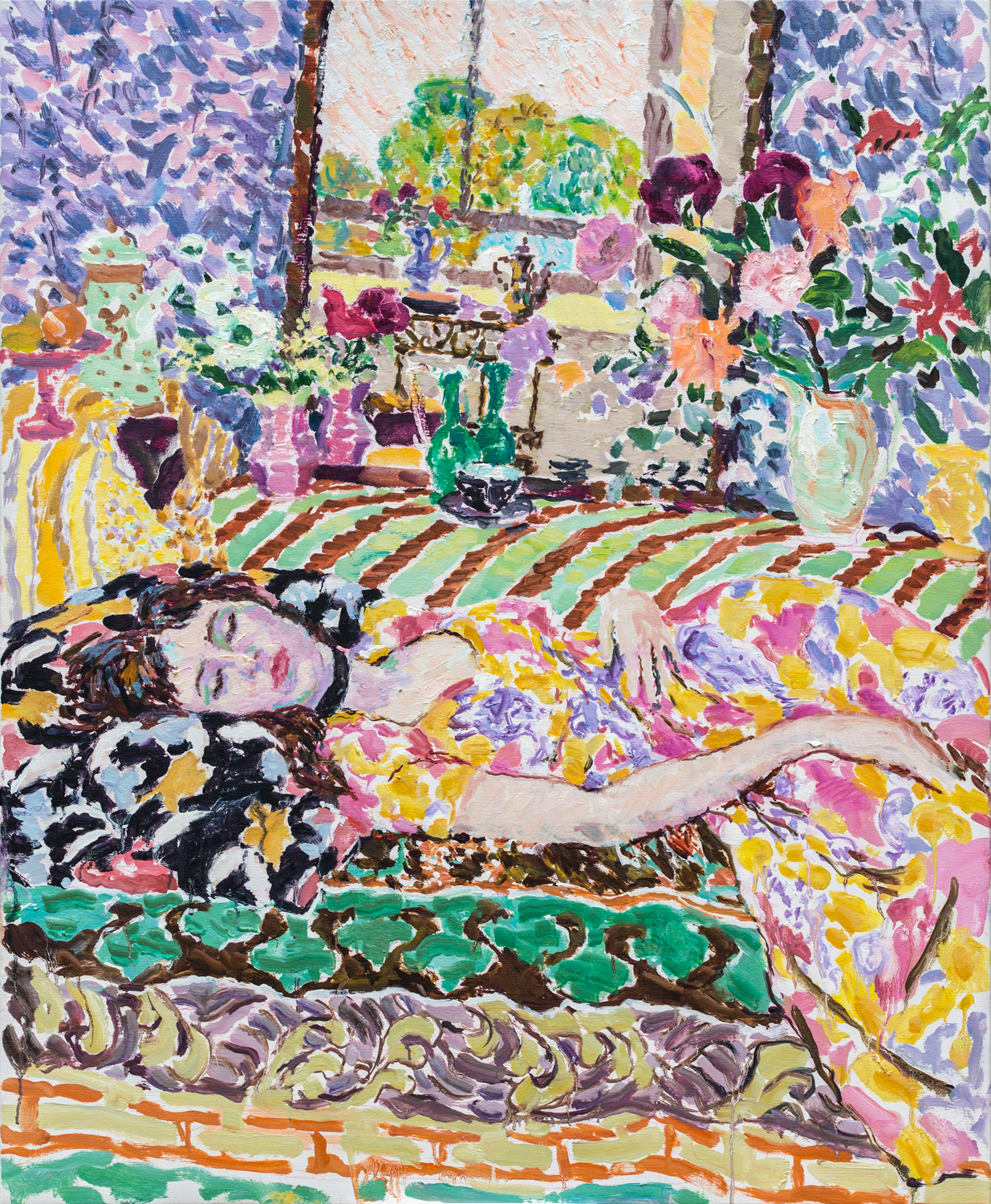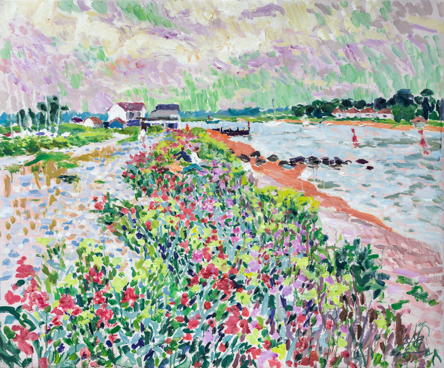 Grenville refers to himself as a romantic but acknowledges a fascination with pattern and color that places him in the tradition of Henri Matisse. The figures and the everyday objects that surround them in his paintings express his joy in life, light, and color. Less evident, but equally important, is a feeling of intimacy that recalls Matisse contemporaries, Pierre Bonnard and Edouard Vuillard. It is here that we see Grenville being influenced by the principles of Les Nabis – a group of young post-impressionists, avant-garde Parisian artists of the 1890s who influenced the fine arts at the turn of the century. One of the Les Nabis’ goals was to integrate daily life into their paintings and cover a flat surface with colors assembled in a certain order, as we see Grenville doing with such grace and sensitivity. Layers of feeling peel back to disclose a spiritual intensity. In the artist’s words, “the world around us becomes a poem revealing something about how it feels rather than how it looks.” Grenville also describes himself as a colorist. His palette is bright and jaunty: lemon yellow, violet, mauve, and pale blue are colors that appear regularly in his paintings. “The sea does not have to be the blue that you saw,” he explains. “It can be pink, or it might be red, or it might be violet. There is this sense that we can use color as a tool for linking the viewer with the emotional experience of being in the landscape.”