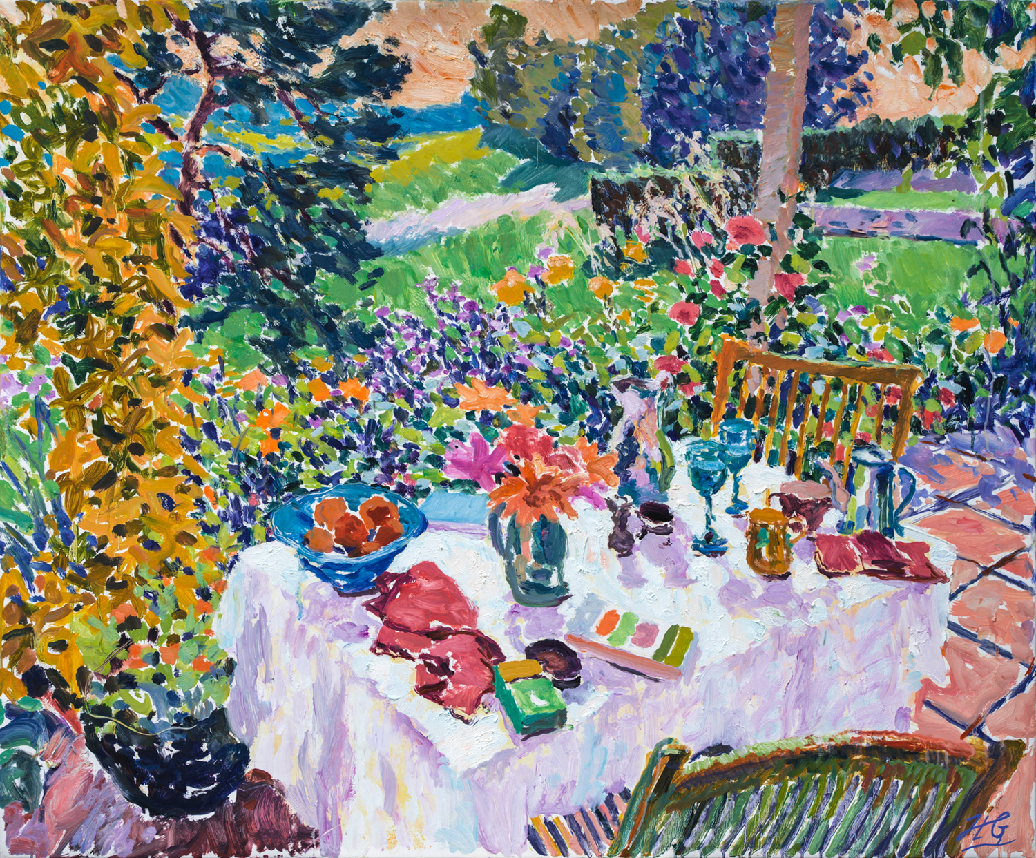 Several years ago, Grenville and his family moved from London to the “Red House” in Waveney Valley, Suffolk. The house, dating to 1650, still has a Georgian façade, beautiful old shutters, and many other period details, Grenville’s passion for color, so evident in his art, lead him to paint the interior peacock green, duck egg blue, and violet – bright, bold hues the Georgians would have used. The rooms of the “Red House” provided the backgrounds for several of Grenville’s interior and still life paintings. He now paints ceaselessly in his Dorset garden studio, which he shares in summer with his students. In addition to teaching, he is a gifted lecturer with extensive knowledge of art history and a writer whose articles on painting appear regularly in The Artist Magazine.