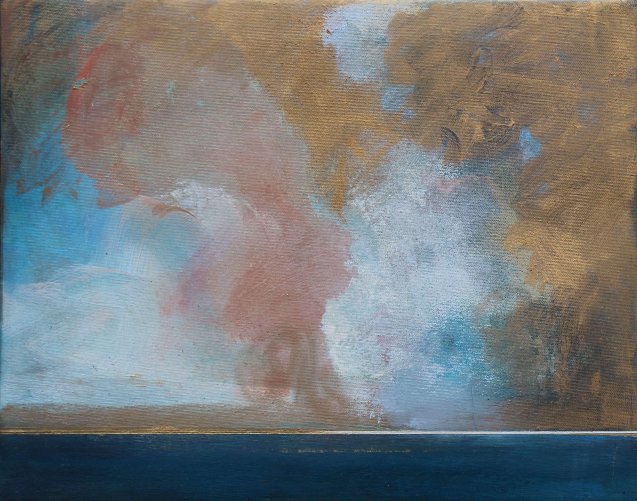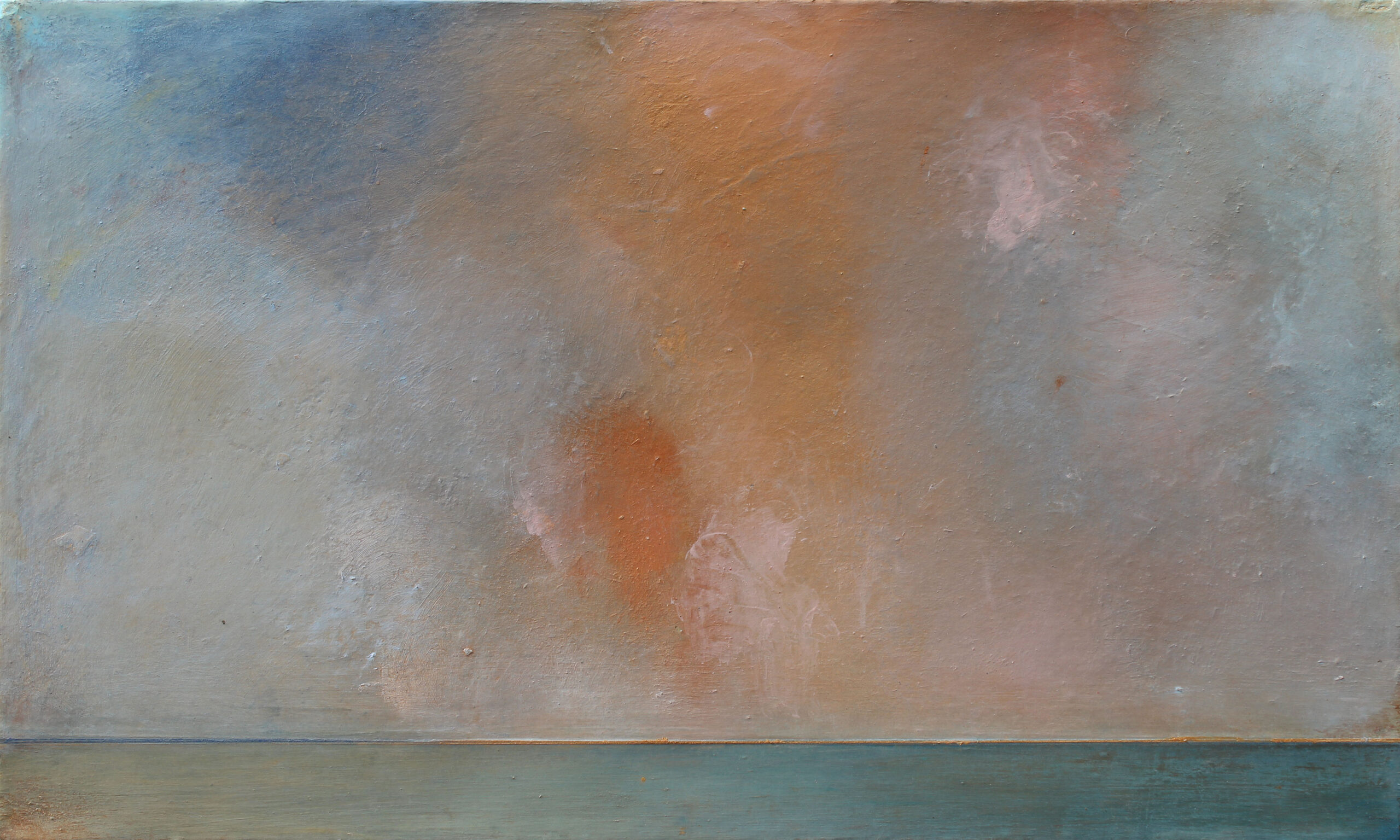 Belgian linen is my preferred surface—it provides a rich texture that forms the foundation of my work. I begin by laying down gesso in the traditional manner. Once dry, I apply a layer of copper paint, inspired by the protective coatings used on wooden marine vessels. This creates an atmospheric ground that reflects the movement of the sea and sky, always anchored by the horizon line.