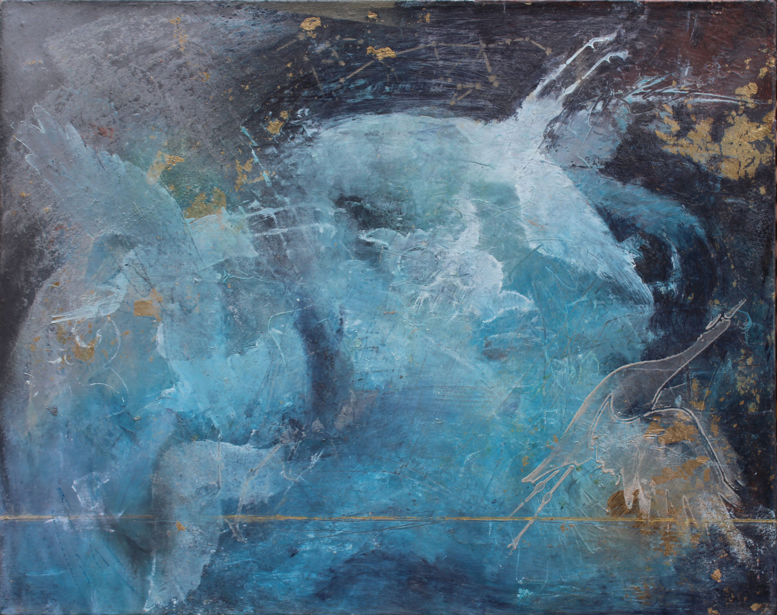 After moving to Springs, New York, Knott embraced plein air painting, capturing the transient qualities of the ocean and its changing light. Her technique involves layering oil paint, metallic pigments—including gold, silver, and lapis lazuli—heated beeswax, damar varnish, and linseed oil, then repeatedly scraping and reapplying, creating what she calls a “skin of memory.”