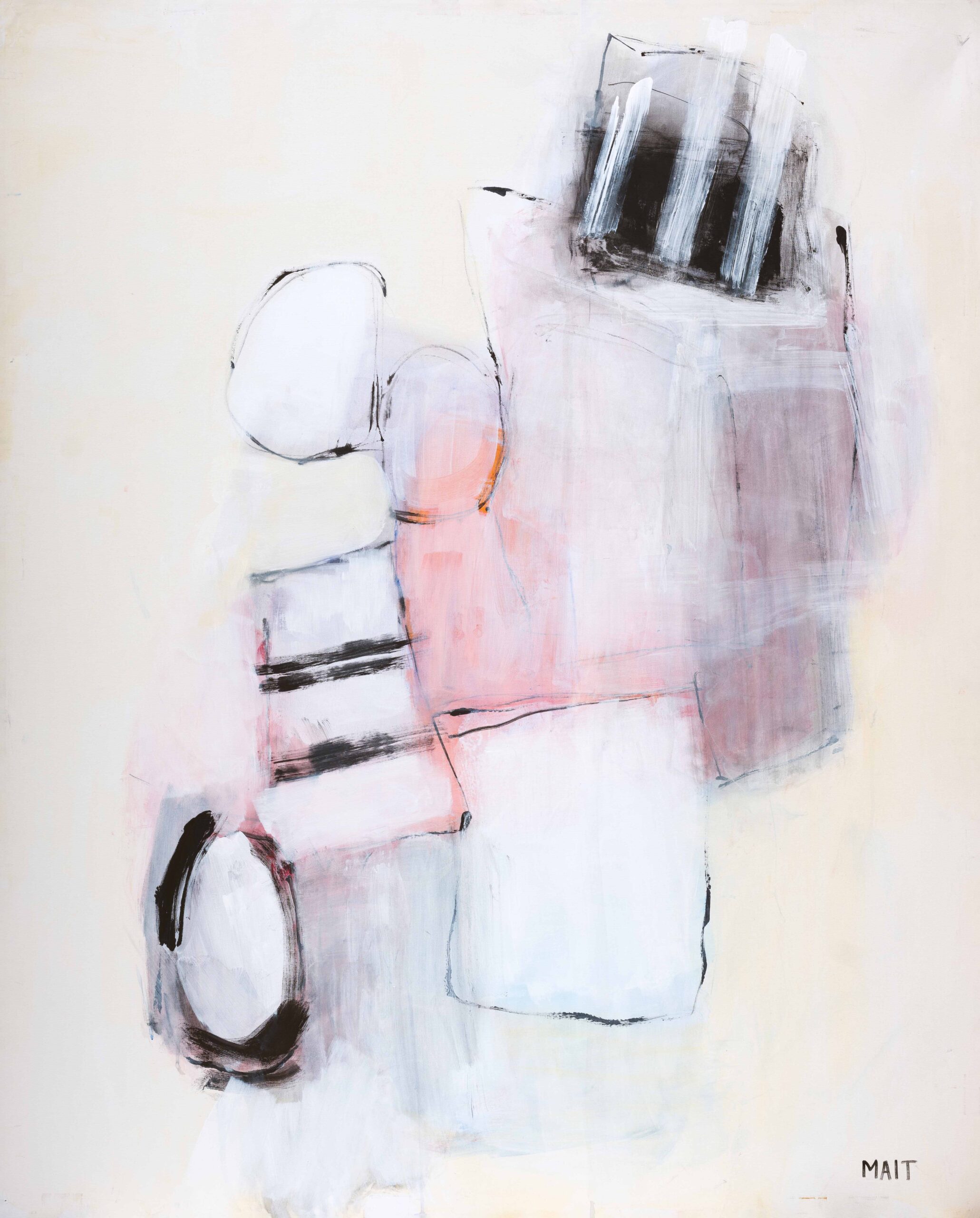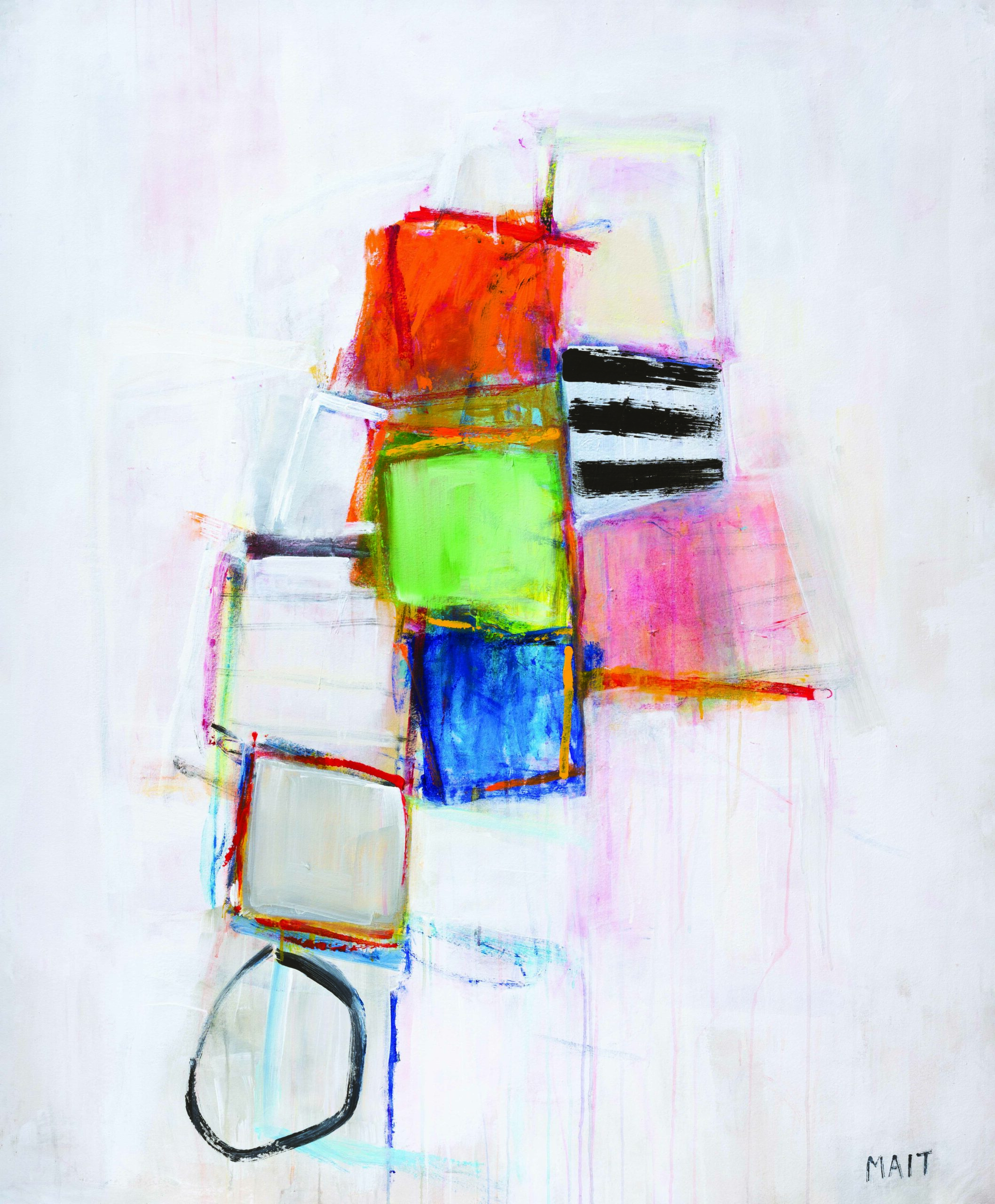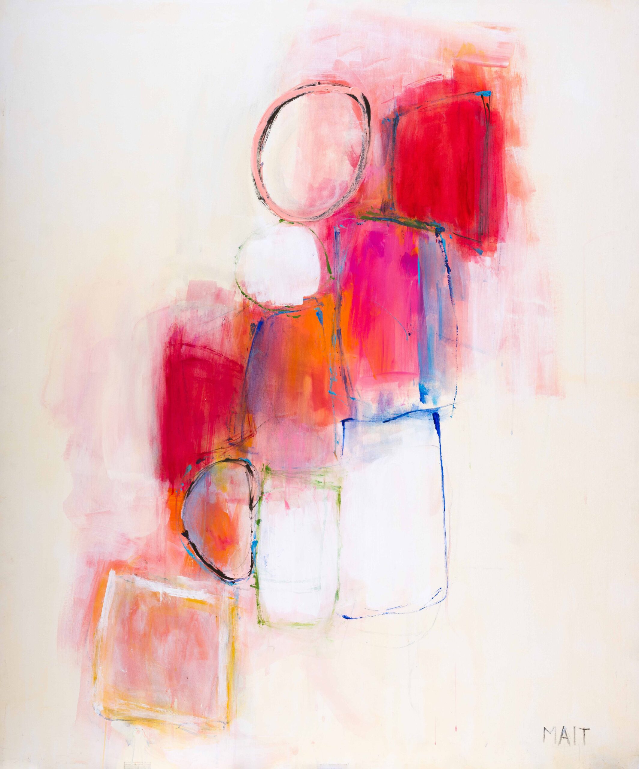 Mait prioritizes fundamental elements such as space, color, and balance in her approach to the canvas. She endeavors to remain as unprepared and unpremeditated as possible at the outset of her creative process to preserve an authentic expression. In these moments of creation, she draws inspiration from a rich internal landscape—a synthesis of visions, dreams, and emotions characterized by spontaneity and executed with meticulous balance. The vibrancy of her color palette resonates with the sense of optimism that she aims to convey through her work. Equally significant is her strategic use of white; the spatial presence it occupies is essential in defining her overall composition.