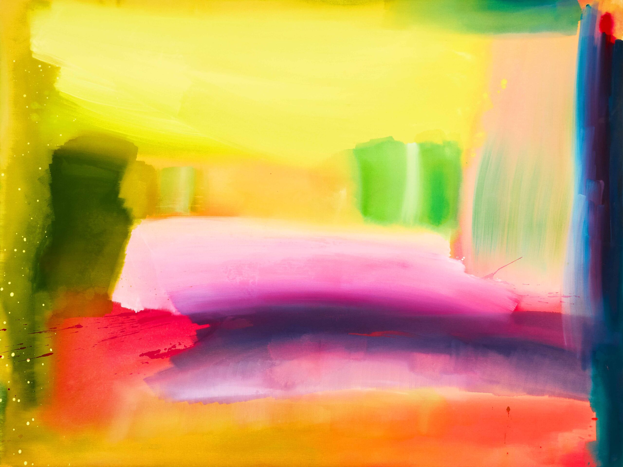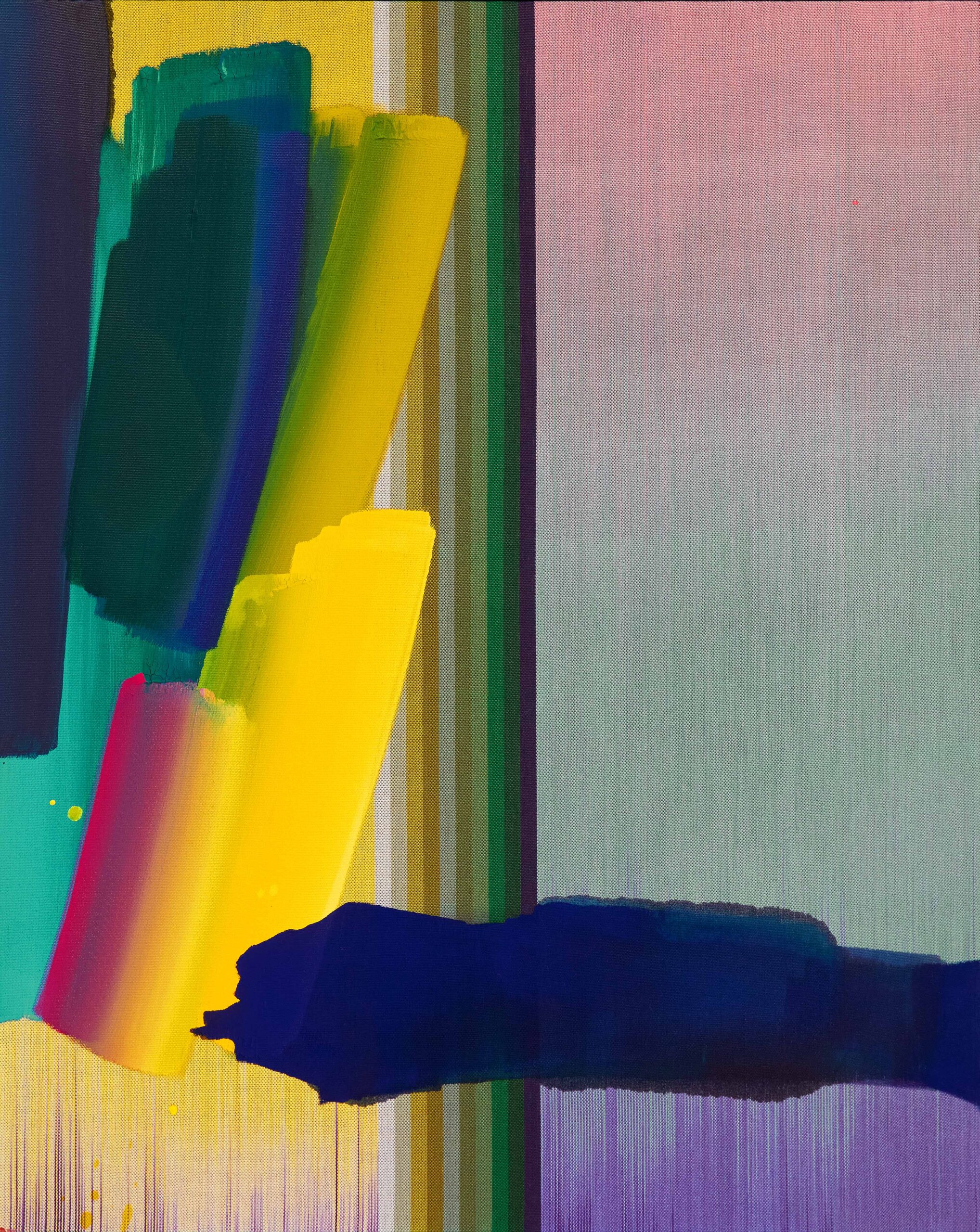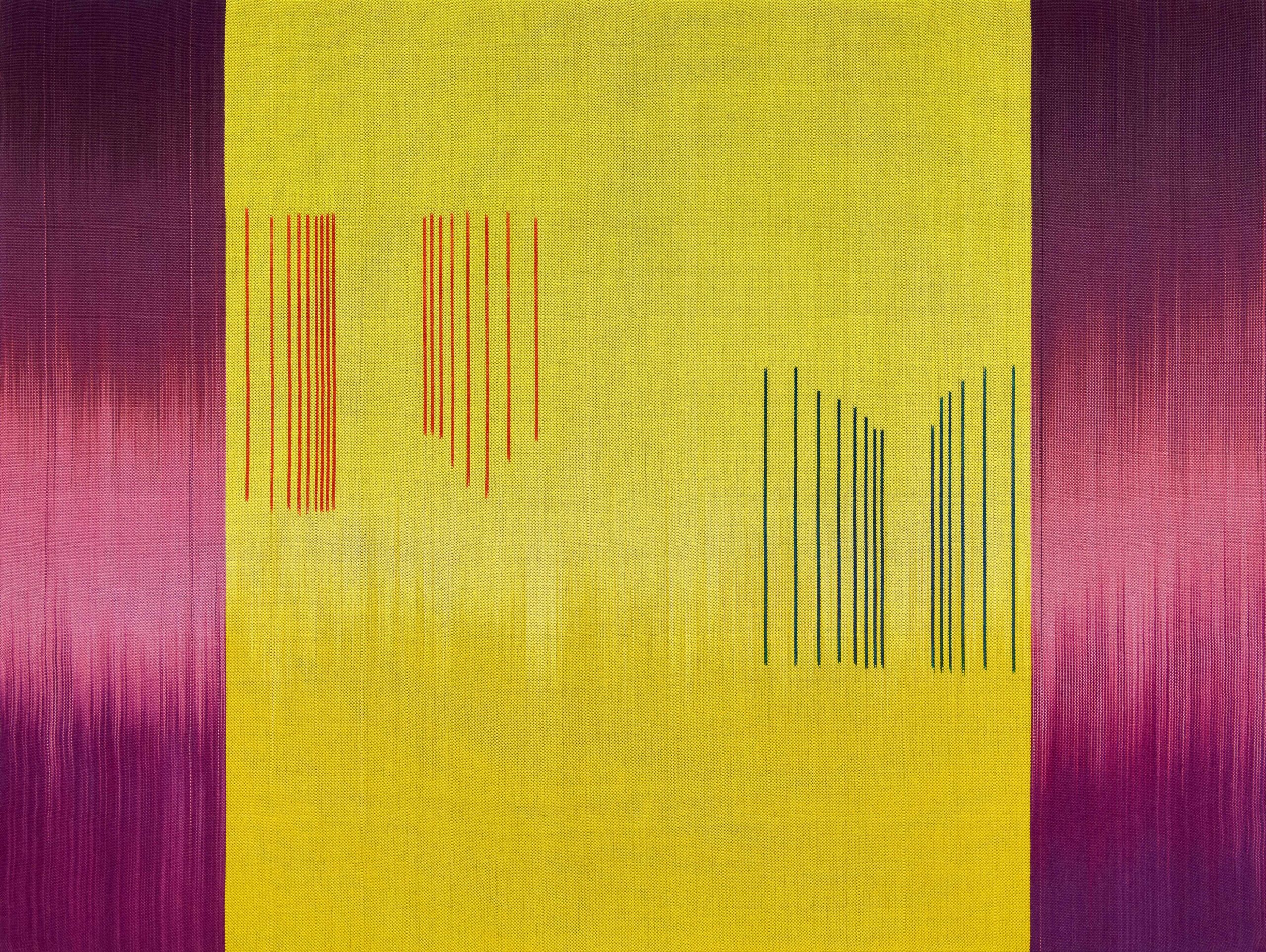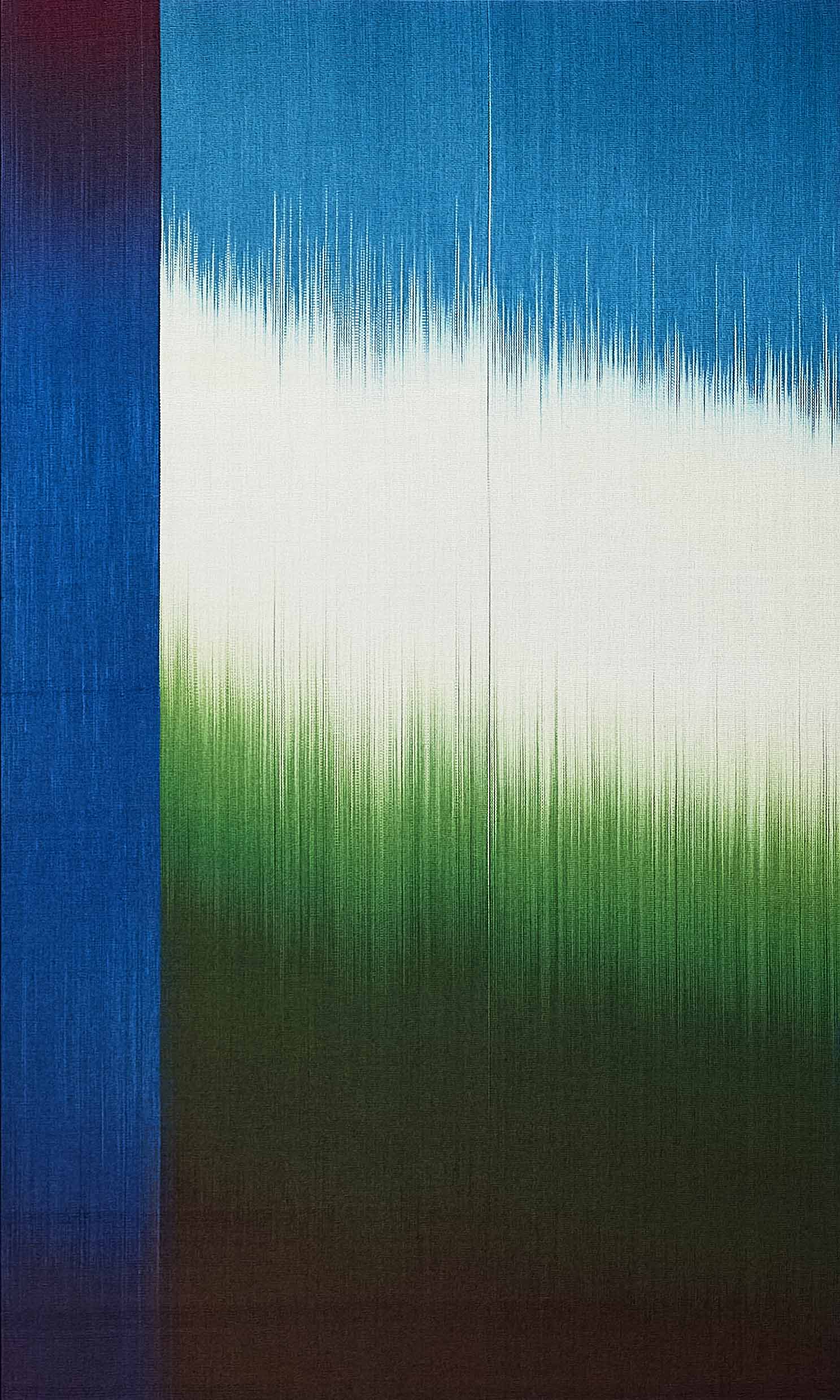 Across this new series, Mann continues her long-standing exploration of the boundaries between textile and fine art. Her expansive canvases glow with atmospheric gestures and luminous color fields that evoke abstracted landscapes, while her woven works distill color into refined, minimal compositions. The “Thread Paintings” bring these languages together—painted veils hover above woven grounds, creating layered dialogues between structure and surface, gesture and precision, spontaneity and control.
