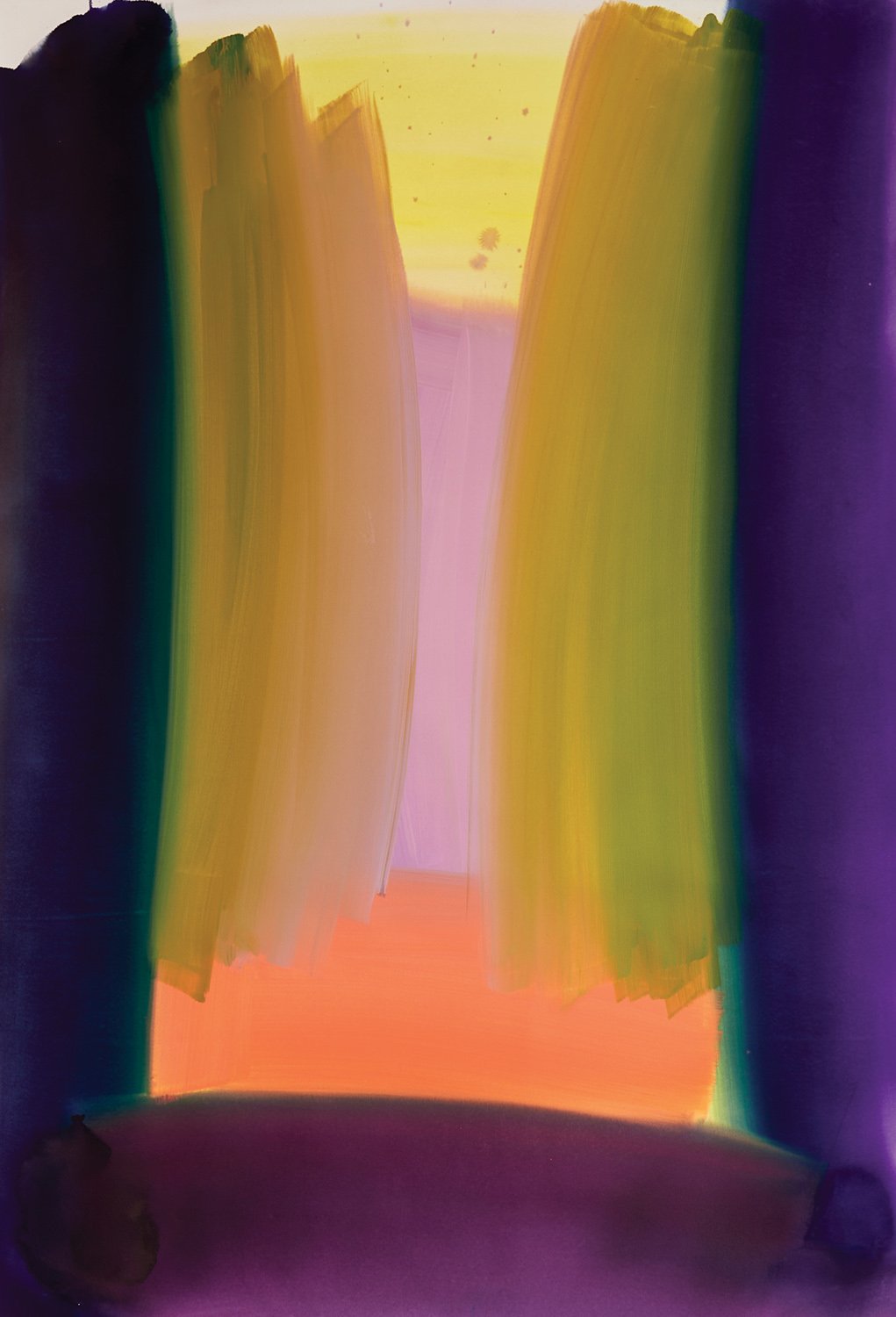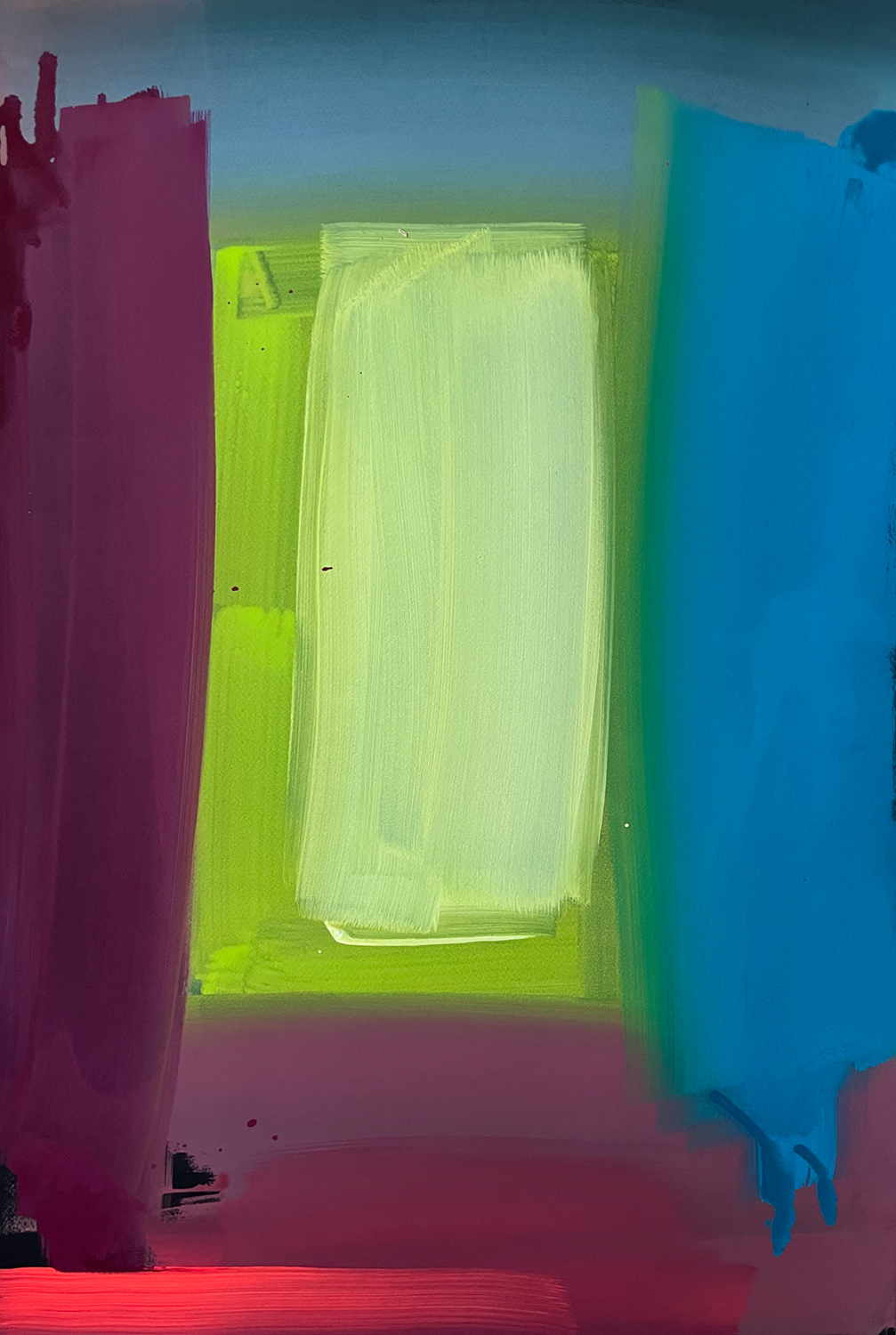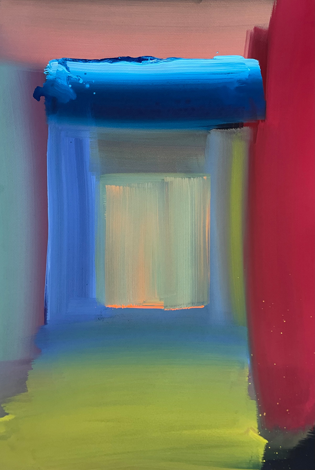 “For a long time, I’ve been interested in two specific things: accidental colour and unconscious colour. It transpires that these two ideas; when filtered through the act of painting, reveal a surprising vivacity and capture a dynamic colourful moment…In complete contrast to the exquisite slowness of the woven artworks these pieces are large scale punches of spontaneous, emotional colour.