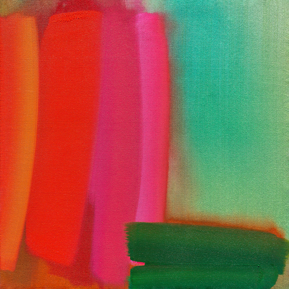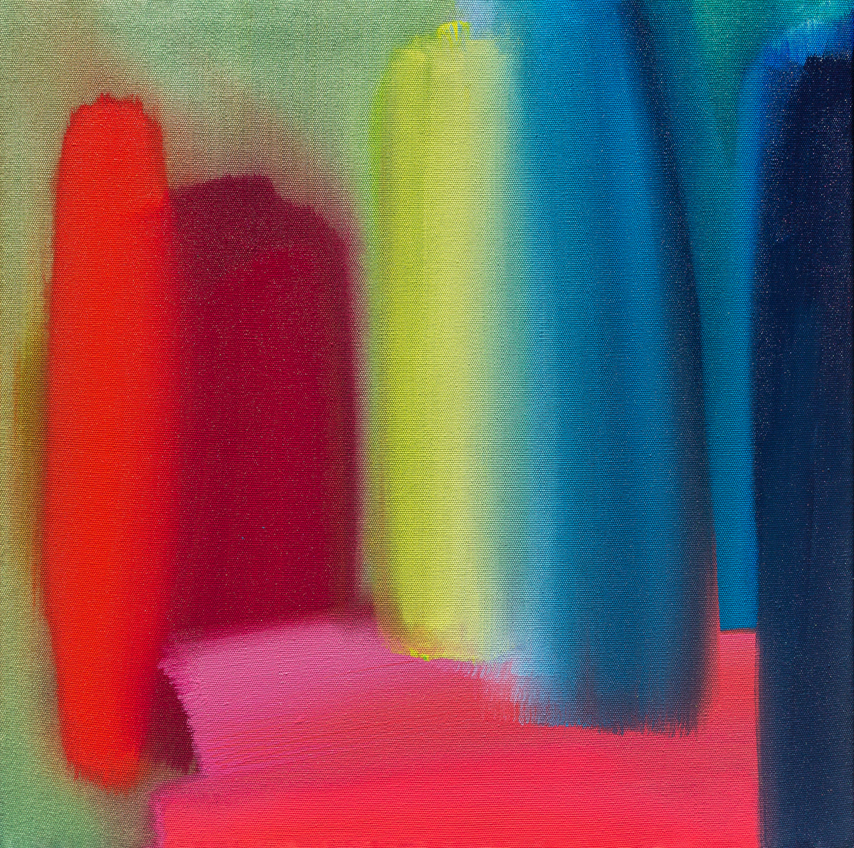 The synergy between the woven works and the paintings is striking – despite being opposites in their making process they share a surprising energy and connect to each other completely. Both techniques project light through colour and are steeped with intuitive colour theory investigations. It is the interaction between colours that makes this work sing; alongside complex tonality and saturation.”