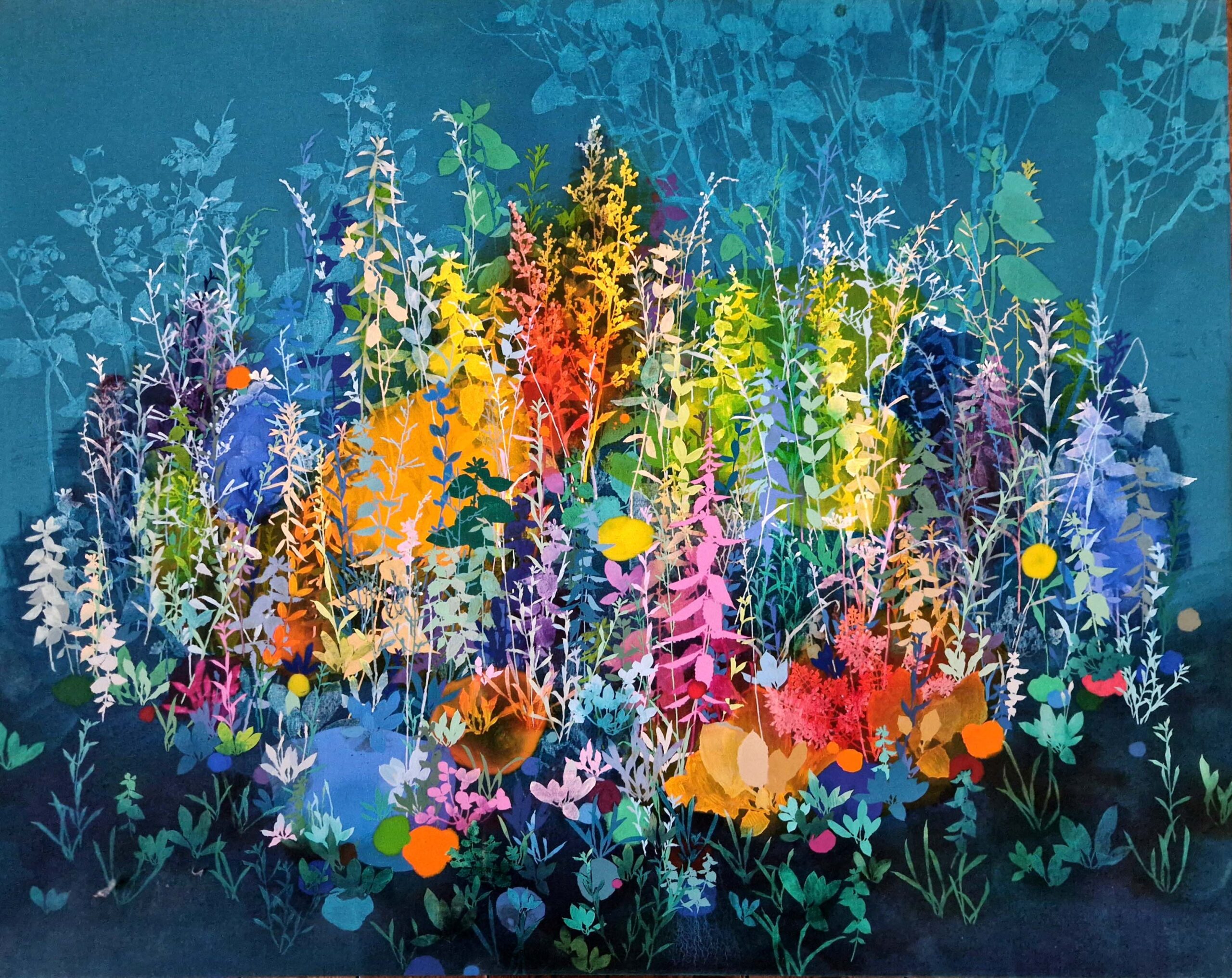 In this new body of work, layered vegetation—branches, stems, and flowering forms—emerges through veils of saturated pigment. These elements remain suspended between presence and dissolution, inhabiting a pictorial space in which depth is continuously reconfigured. Color functions with precision, both organizing the composition and dissolving its boundaries, resulting in surfaces that are at once structured and atmospheric.