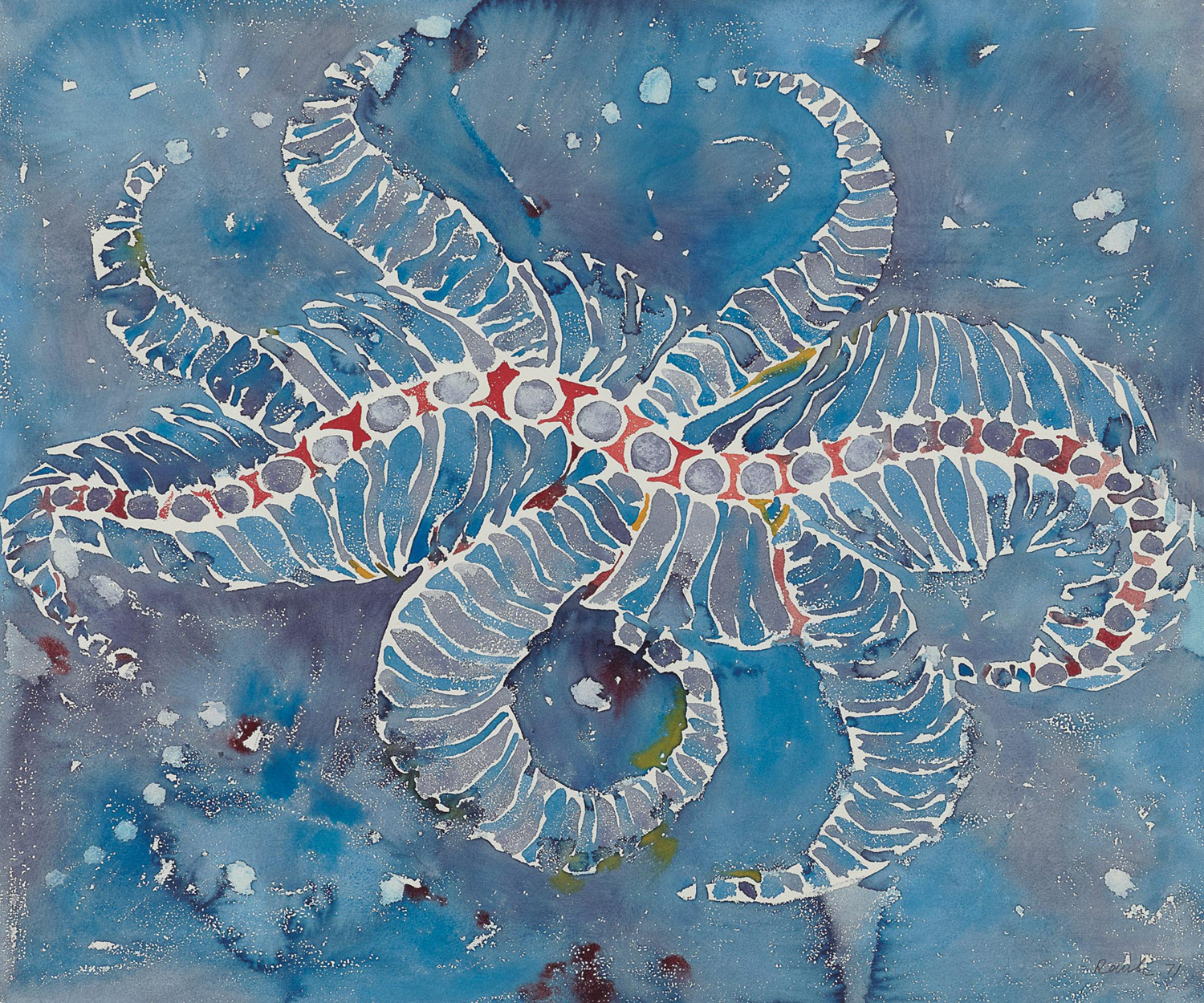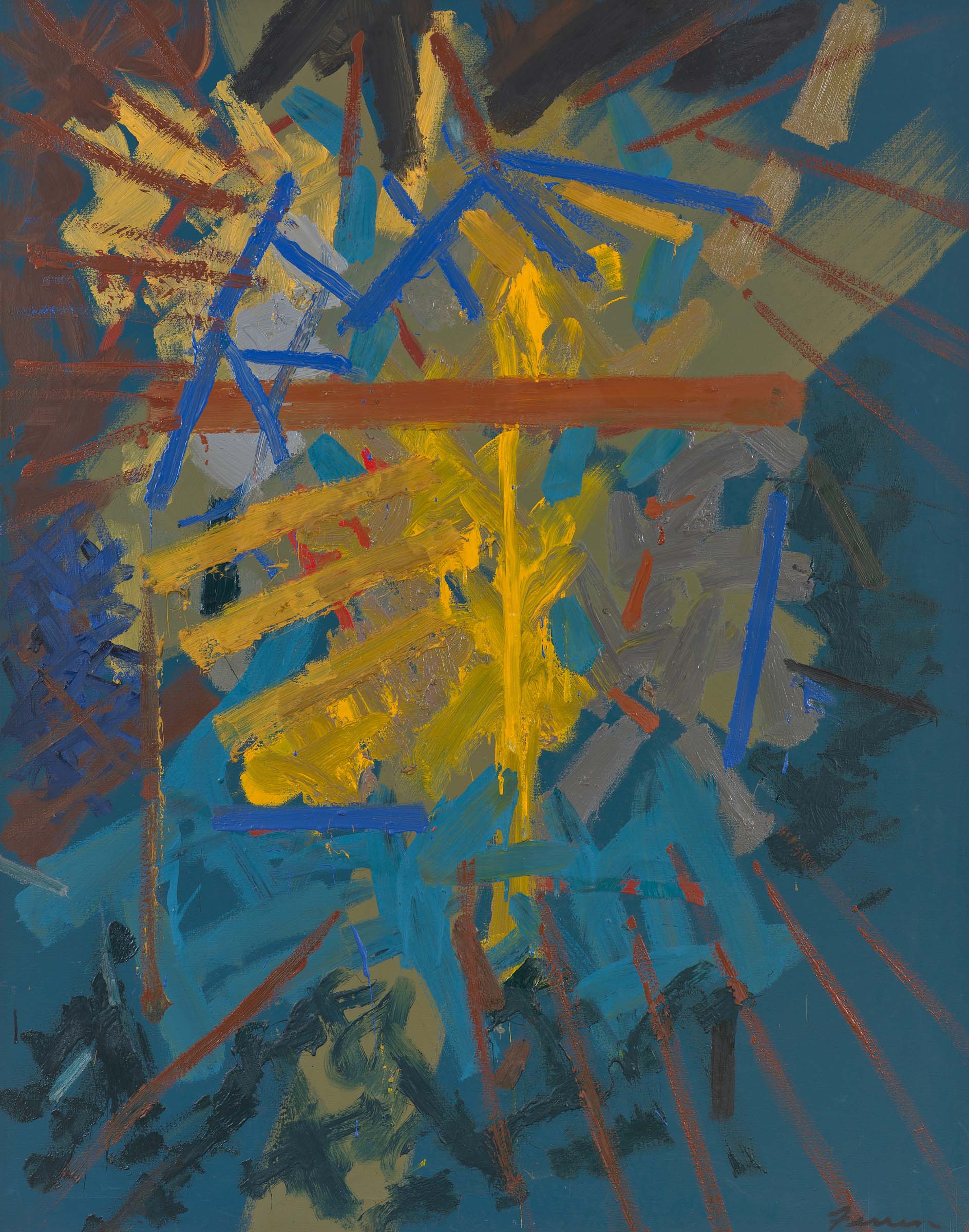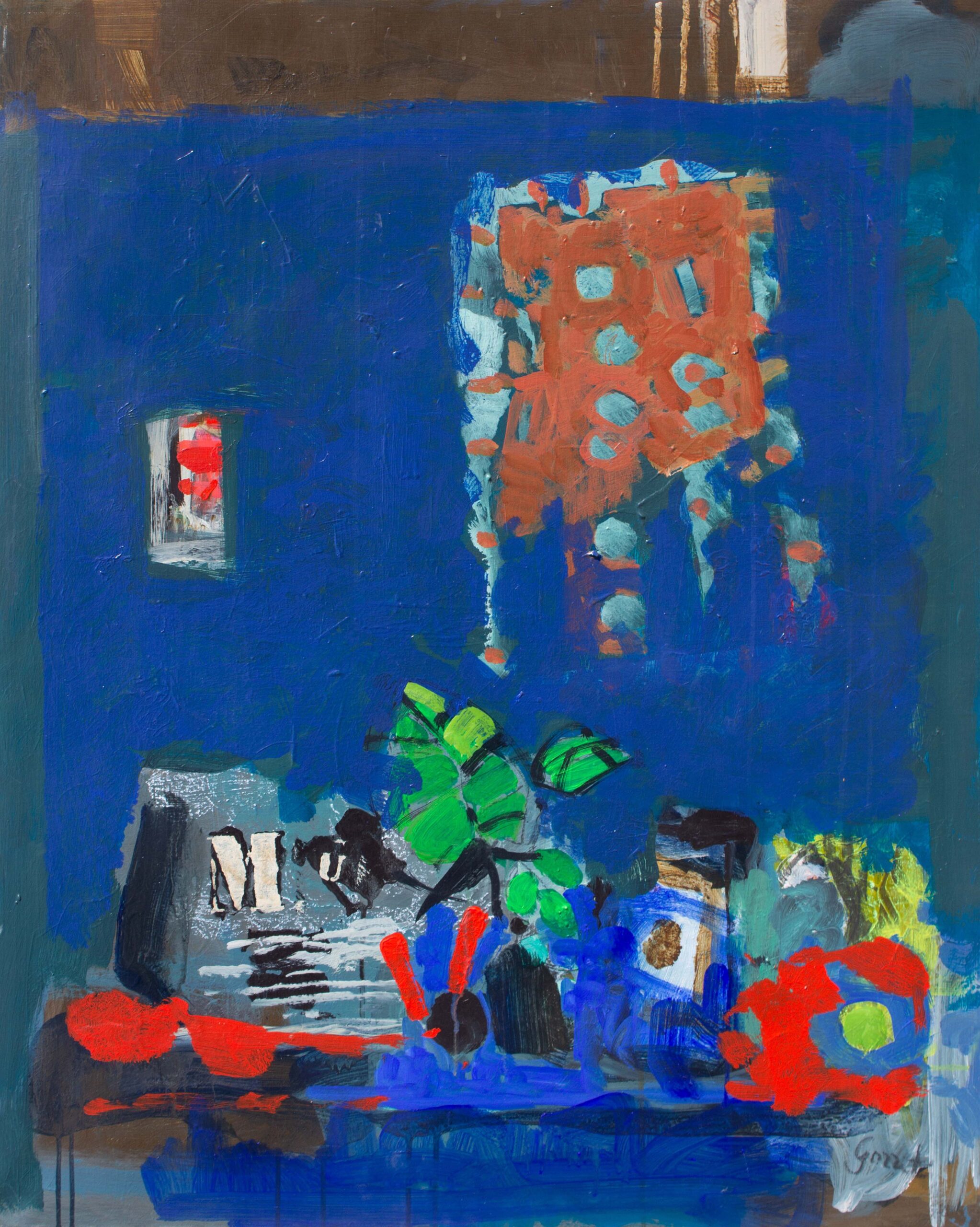 Something Blue includes a diverse range of artists who have applied the color through various mediums and styles. As a ubiquitous color present in our skies and seas, blue is necessary for representational work, such as Jean Dufy’s Le Pont Alexandre III, which uses multiple hues of blue to depict the sky and the Seine while emitting a Fauve-inspired energy. Blue is used to a similar effect in Jean Jules Cavailles’ Les Petroliers a Lavera, which depicts oil tankers floating on a vast expanse of blue water on an idyllic Mediterranean day. In other examples, the hue is used abstractly, such as Ptolemy Mann’s Alqa (Between Orange and Blue), a painting that brims with undulating fields of blue, hitting an emotional note amongst an emotional medley of vibrant colors. Its abstract application can also be found in Ronnie Landfield’s Freedom on High, where acrylic paint is diluted with water to create a complex, serene piece that channels landscapes and nature. Additional artists including Gordon Onslow Ford, Robert Natkin, Henrik Simonsen, John Ferren, Mary Sipp Green, and Ilya Bolotowsky who all offer their interpretations of the vast possibilities inherent in the color blue.