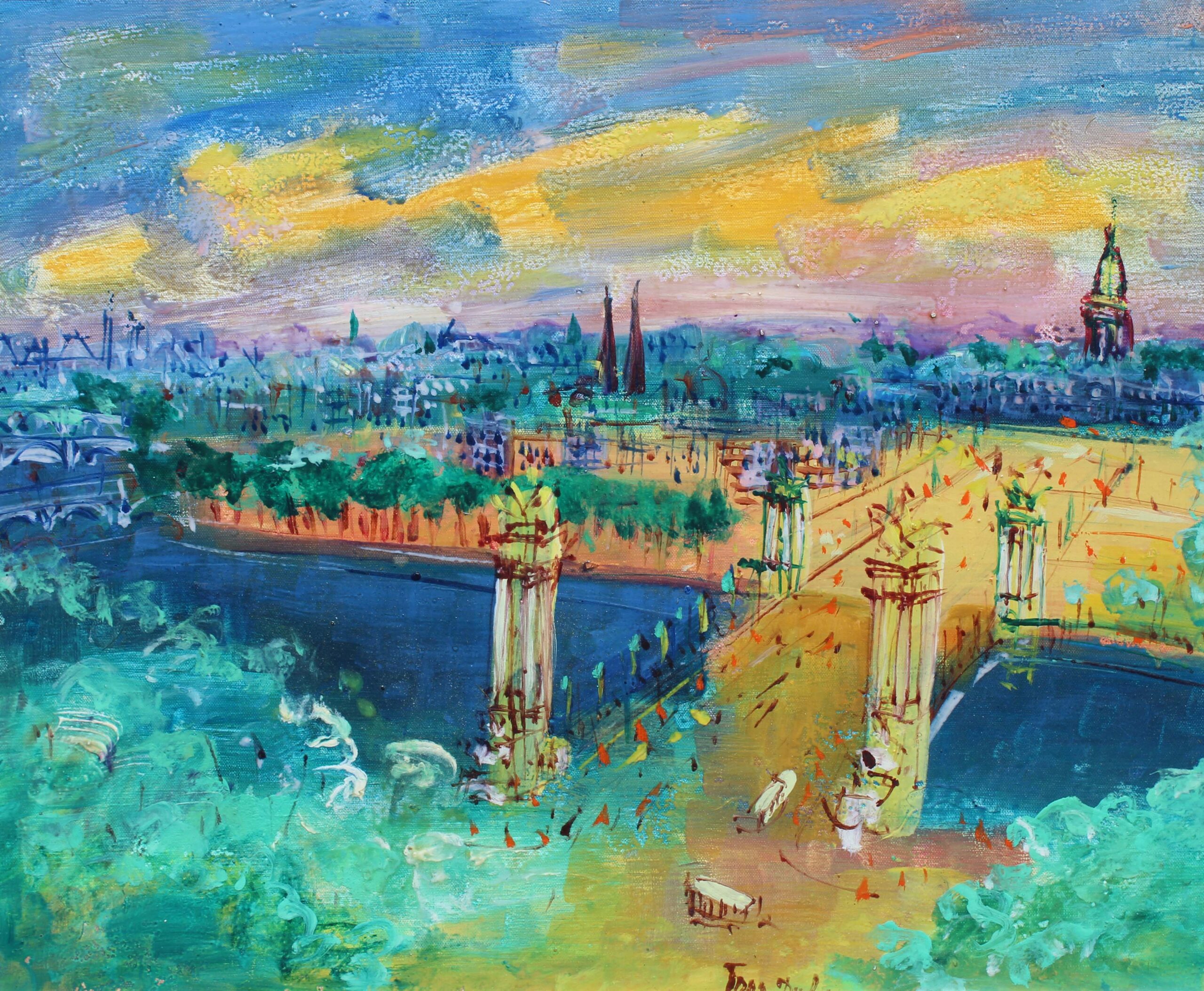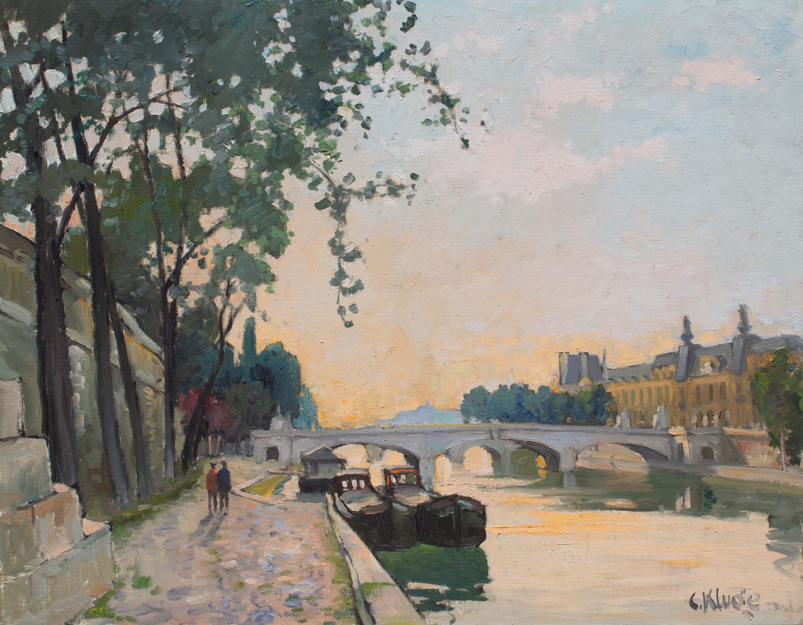 The Seine was another subject that captivated artists. As the picturesque river winds through the city, it passes under architecturally impressive bridges, one of the most majestic of which is Le Pont Alexander III, depicted by Jean Dufy. In Dufy’s painting, the Beaux-Arts style bridge is shown from the Champs-Elysées quarter looking towards that of Invalides. The palette is rendered in bright jewel-like colors, suggesting the sun’s brilliance on the water and landscape. By contrast, La Seine a Paris by Constantin Kluge offers a different interpretation. Here, the Seine is shown bathed in the soft light of the setting sun. The mood is tranquil and contemplative — a Paris of quiet beauty.