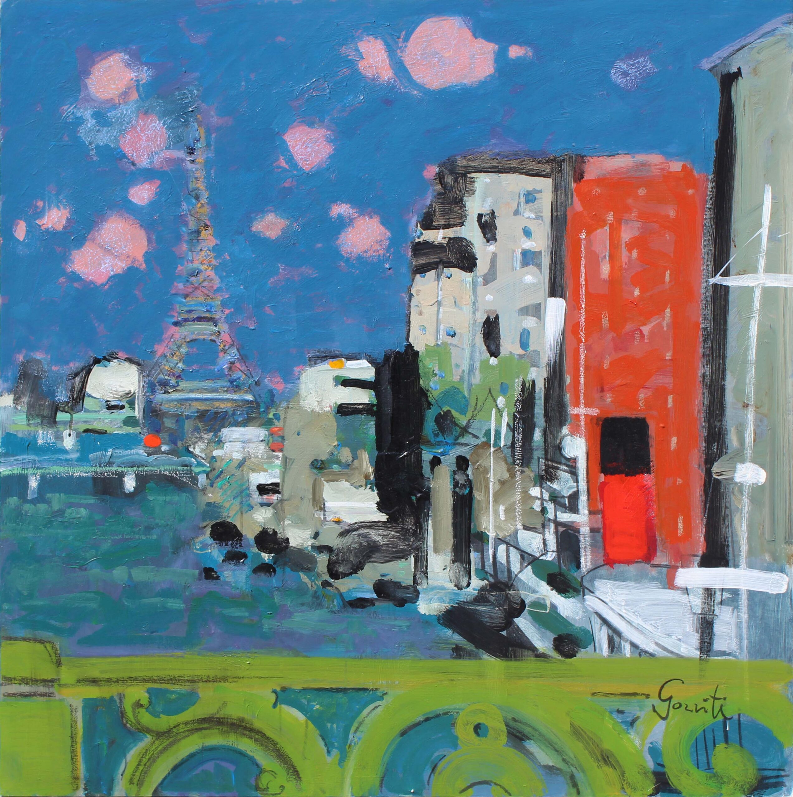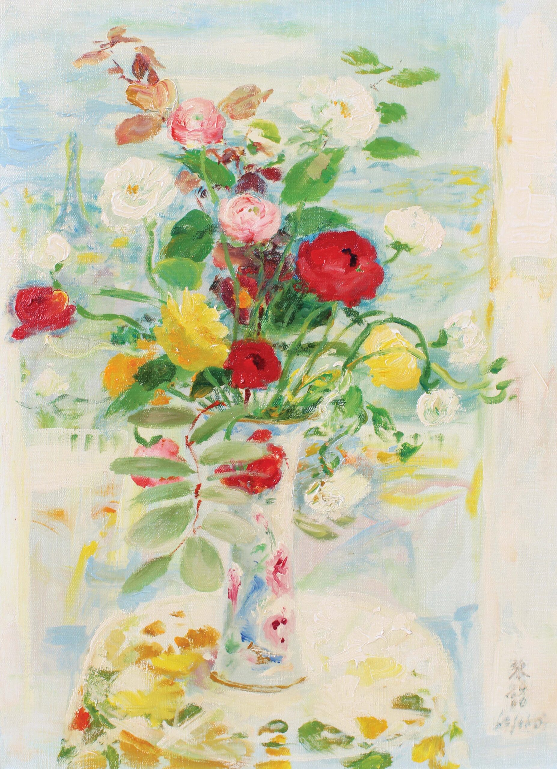 Voyage À Paris explores a variety of interpretations of the city by over a dozen artists. The iconic Eiffel Tower inspired Gilles Gorriti and Le Pho. Le Pho moved to Paris from Vietnam and embraced his adopted city, becoming a permanent resident and establishing a successful career. In Bouquet Devant la Fenetre, Le Pho presents the viewer with a lush bouquet before an open window through which we view the Eiffel Tower, an instantly recognizable monument situating the scene in Paris.