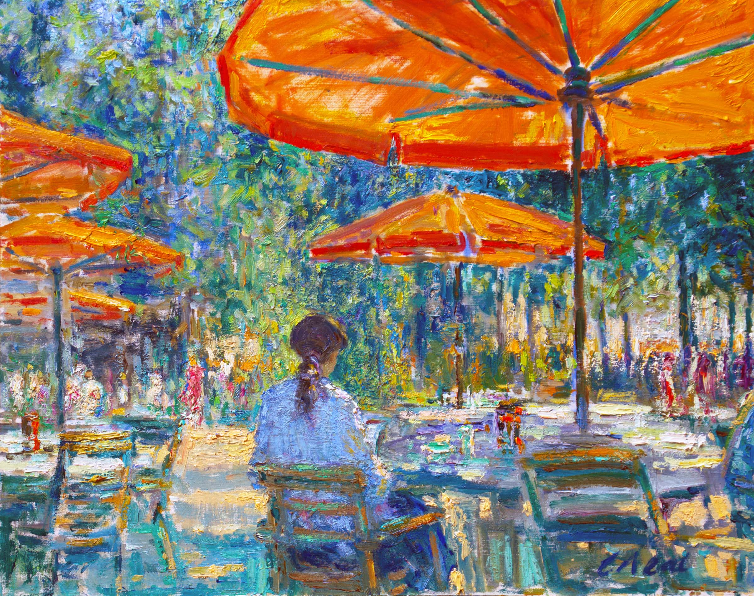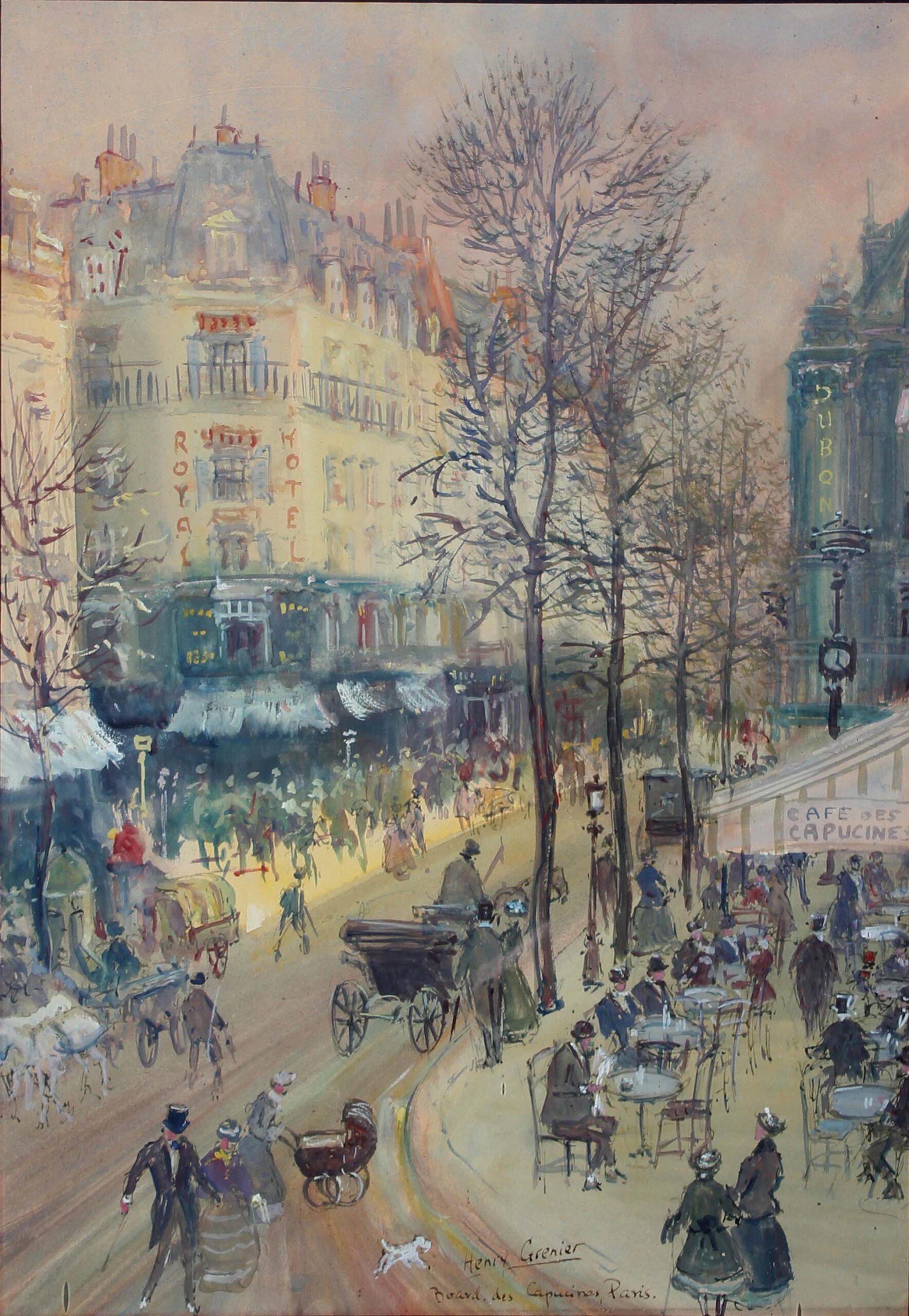 Nature, too, was the inspiration for many artists. Paris is well recognized for its superb gardens and parks, attracting painters wishing to experience and portray the sublime garden architecture and plantings. In Morning in Parc Monceau, Charles Neal’s Impressionist-style painting focuses on the bountiful profusions of blossoming flowers and the inviting garden pathways. The gardens were also meeting places for people to gather, as shown in Neal’s vibrant painting Café Scene Jardin des Tuileries, Paris.