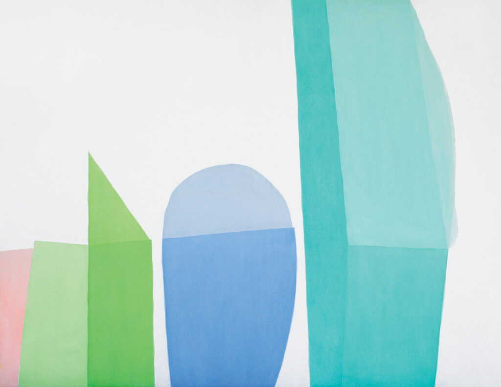 After Braguin’s second solo show at Poindexter Gallery in New York in 1975, he began increasingly working with tinted colors, allowing them to take over his previously white backgrounds. He was reaching a new peak in the maturity of his style. From the early 1980s onwards, Braguin introduced smaller elements and linear patterns that complemented his carefully balanced geometric shapes.