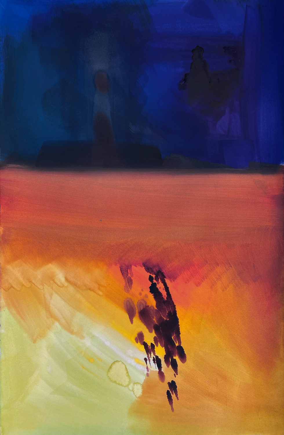 “These paintings are an ongoing series of works created on black watercolour paper that explore our relationship to darkness and beauty. Their dark ground creates an extraordinary feeling of depth and colour. Three dimensional explosions of intuitive mark making. In October 2013 I went around the corner from my studio in London to see the Paul Klee show at the Tate Modern. I remember noticing that several of his paintings appeared to be painted on top of a black ground and the notion of what happens to a colour when placed over black stayed with me. On discovering this extraordinary, velvety black paper, designed specifically for watercolour paint in 2020, I began using my knowledge of colour theory to test the interaction of darkness against water and pigment. 100% cotton fibers seeped in black overlayed with chalky, gouache acrylic pigment transpire to creative a unique sensuality – a shameless and dark kind of chromatic beauty.”