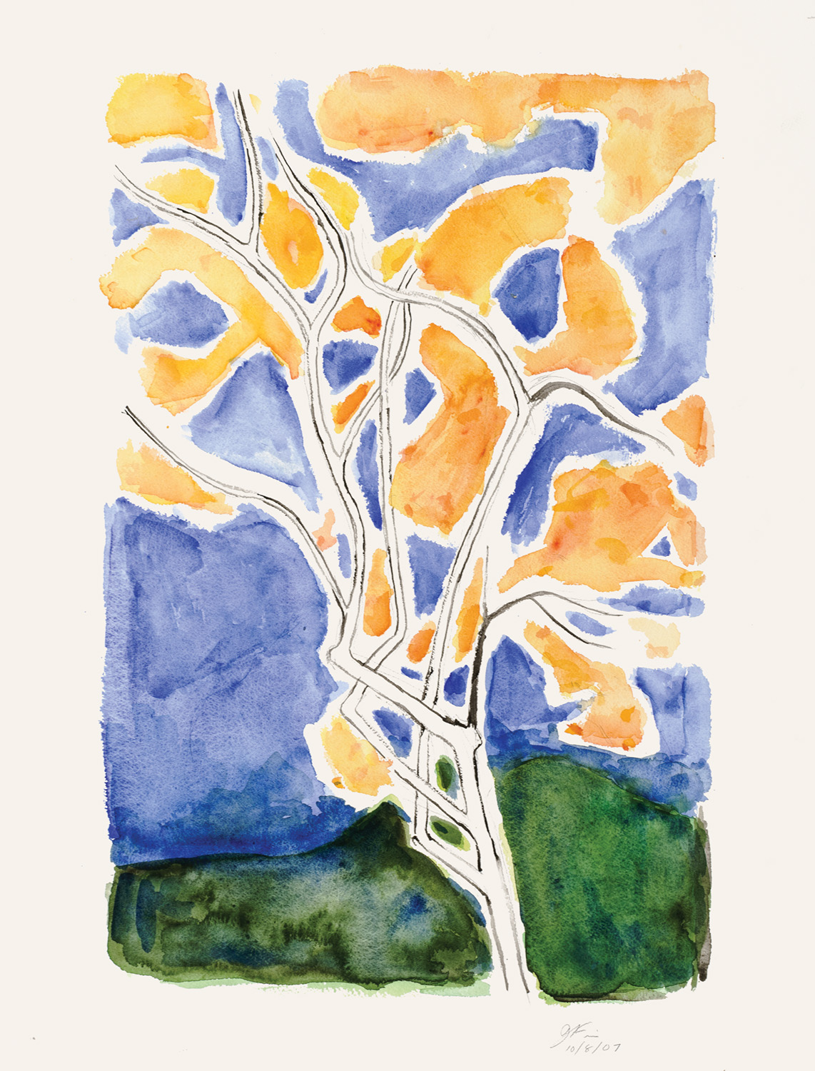 The works included in this exhibition focus on the trees surrounding his Westchester home and utilize various styles, varying from works displaying bold colors and lines to works with a delicate quality, almost oriental in style.